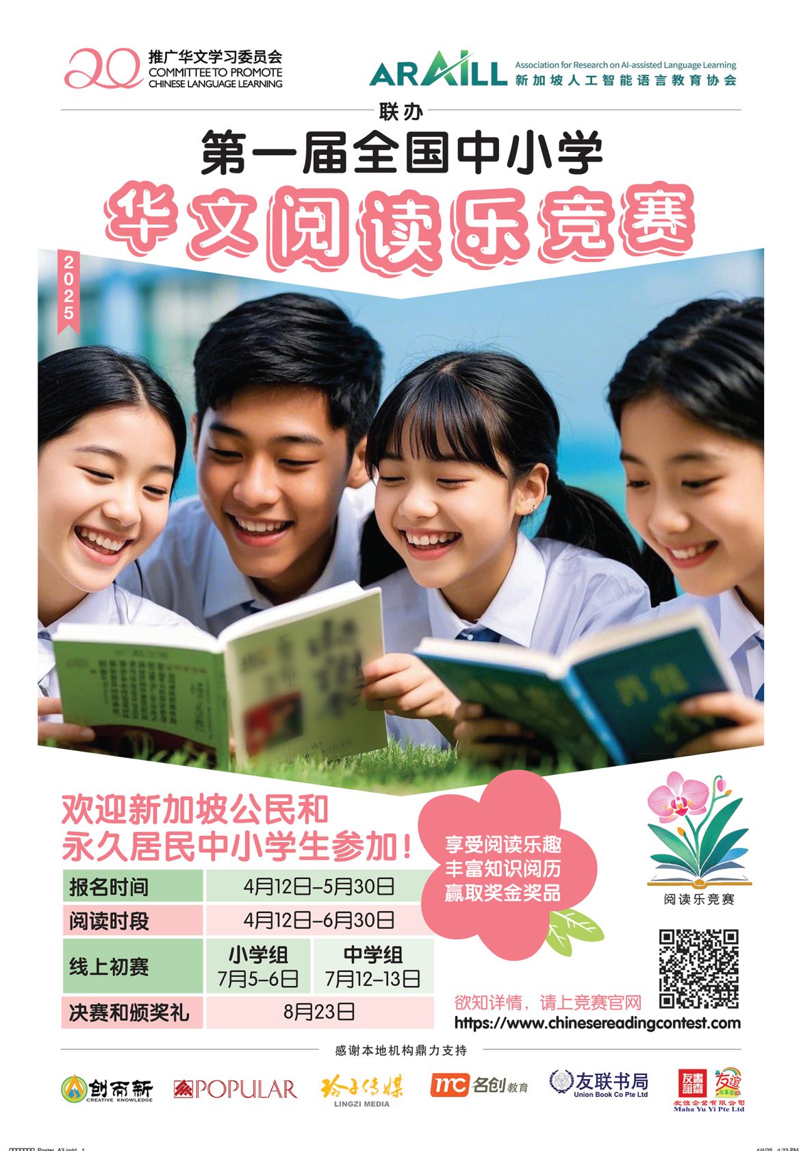 2025年全国中小学华文阅读乐竞赛章程 by Denon Lim March 30, 2025 1.5K 由推广华文学习委员会和人工智能语言教育协会联办的第一届中小学华文阅读乐竞赛,已在2025年4月12日启动。华文阅读乐竞赛是为了推动校园阅读华文读物的风气,培养学生阅读华文读物的习惯。让学生感受阅读华文的乐趣,激发学习华文的兴趣,从而打开中华语言文化宝藏的大门。 只限注册用户 若想继续浏览以上内容,您必须先登录狮城公共阅读室配套。 本配套提供免费预览,请先注册及登入。 Username Password Remember Me Forgot Password Share 0 FacebookLinkedinTelegramLINEEmail